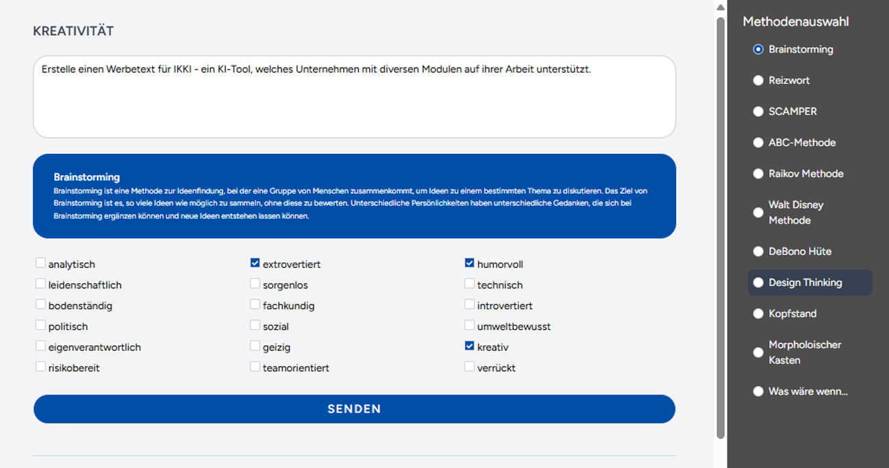 IKKI integriert verschiedene Techniken wie Brainstorming, Reizwortanalyse, SCAMPER, den Raikov-Effekt, Design Thinking, den Morphologischen Kasten und Was-wäre-wenn-Analysen, um Ihre Kreativität zu fördern und vieles mehr.