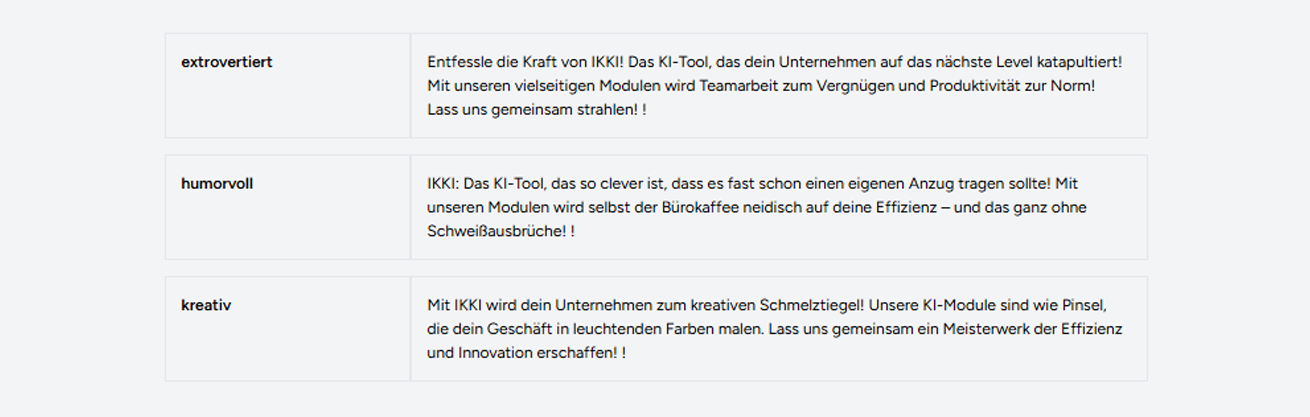 Definieren Sie Ihre Zielgruppe und lassen Sie IKKI Inhalte erstellen, die speziell auf deren Bedürfnisse und Vorlieben zugeschnitten sind. Mit einstellbarer Tonalität erreichen Sie die gewünschte Resonanz.