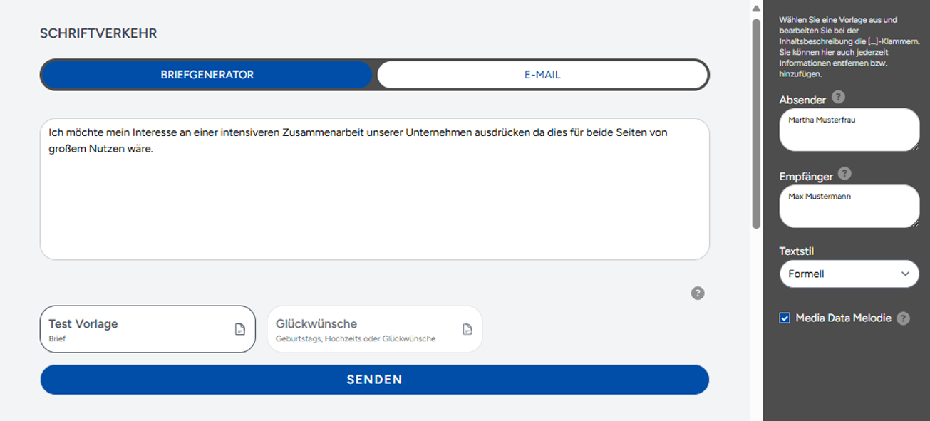 Nutzen Sie eine Vielzahl an Vorlagen und Standardtexten, die speziell auf verschiedene Anlässe und Bedürfnisse zugeschnitten sind. Passen Sie Ihre Schreiben an Ihr Corporate Identity (CI) oder Ihre Unternehmensmelodie an, um Konsistenz und Markenwiedererkennung zu gewährleisten.