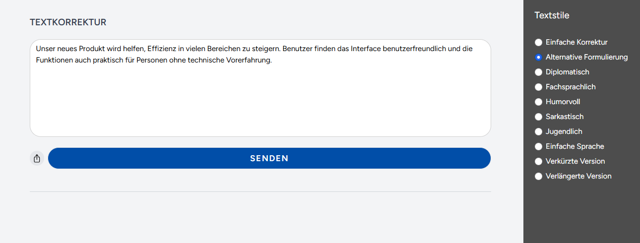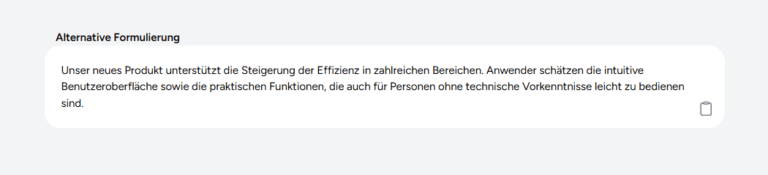 In der Welt der schnellen Kommunikation ist die Korrektheit und Angemessenheit Ihrer Texte entscheidend für den Erfolg. Das Textkorrektur-Modul von IKKI verleiht Ihrer schriftlichen Kommunikation nicht nur Präzision, sondern passt sie auch flexibel an Ihre spezifischen Bedürfnisse an. Ob in geschäftlichen E-Mails, kreativen Texten oder akademischen Arbeiten, unsere Technologie unterstützt Sie in allen Aspekten der Textgestaltung.