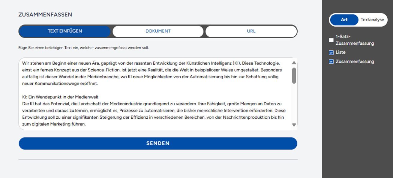 Fügen Sie jeden beliebigen Text in das Tool ein und lassen Sie ihn sofort zusammenfassen.