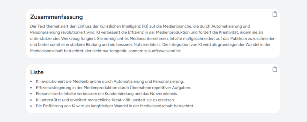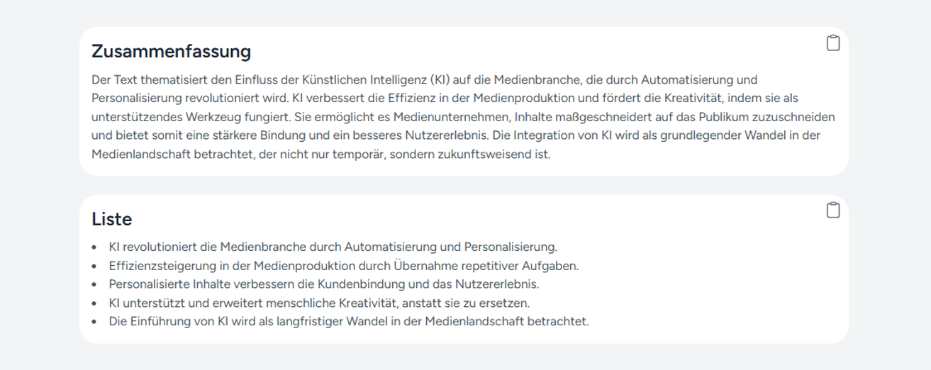 Das Zusammenfassungsmodul kondensiert lange Texte in prägnante Zusammenfassungen, ermöglicht schnelle Informationsaufnahme und hilft Ihnen, sich auf wesentliche Punkte zu konzentrieren, ohne lange Texte durchforsten zu müssen.